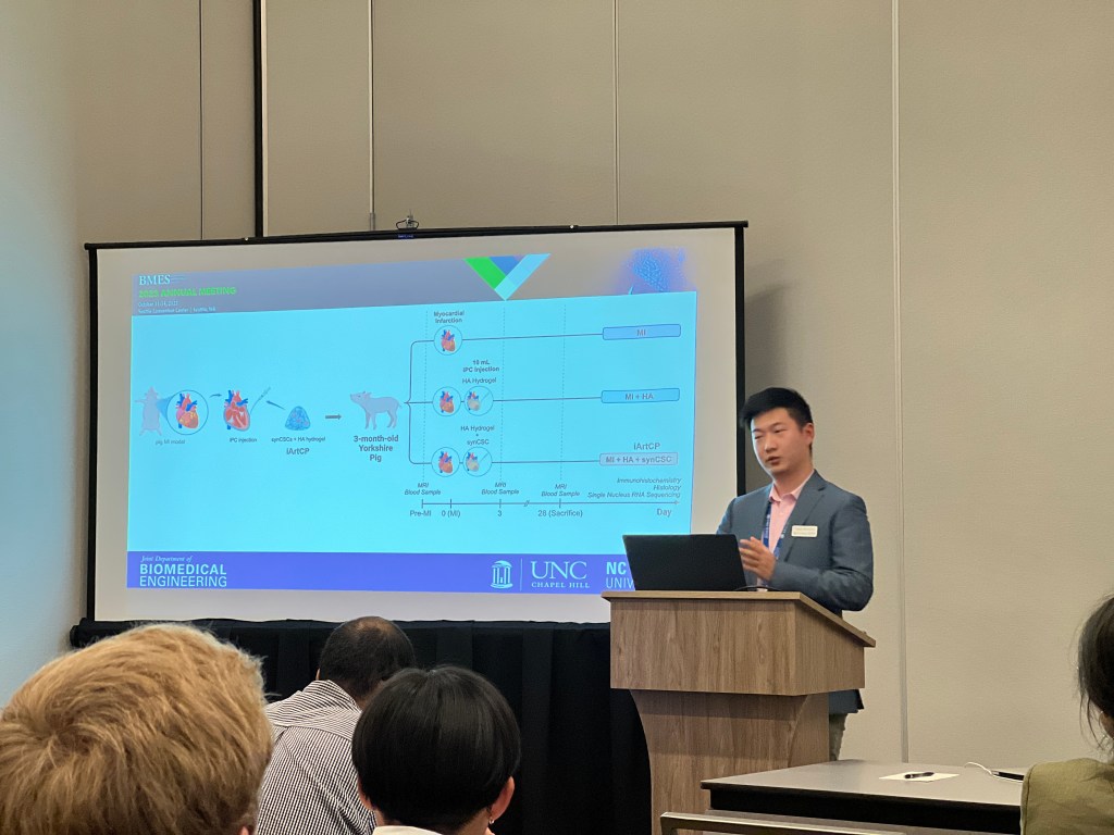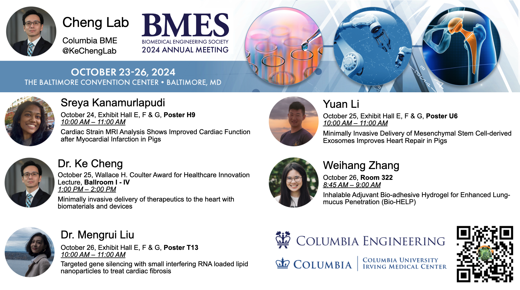 In late October 2024, Cheng Lab presented at the Biomedical Engineering Society Annual Meeting in Baltimore, Maryland. 3 posters and 1 talk were given by our amazing undergraduate, graduate, and postdoctoral trainees. Dr. Cheng gave a Wallace H. Coulter Award for Healthcare Innovation Lecture on Minimally invasive delivery of therapeutics to the heart with biomaterials and devices.