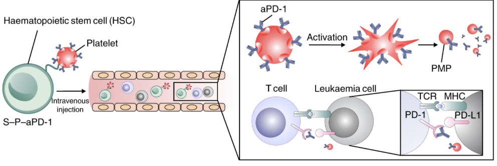 Quanyin Hu, Wujin Sun, Jinqiang Wang, Huitong Ruan, Xudong Zhang, Yanqi Ye, Song Shen, Chao Wang, Weiyue Lu, Ke Cheng, Gianpietro Dotti, Joshua F. Zeidner, Jun Wang & Zhen Gu*. Conjugation of haematopoietic stem cells and platelets decorated with anti-PD-1 antibodies augments anti-leukaemia efficacy. Nature Biomedical Engineering link to the paper: https://www.nature.com/articles/s41551-018-0310-2