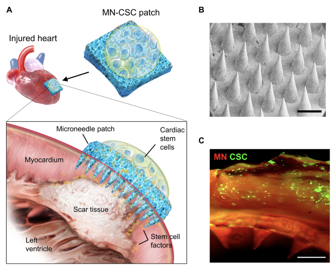 Tang J, Wang J, Huang K, Ye Y, Su T, Qiao L, Hensley MT, Caranasos TG, Zhang J, Gu Z, Cheng K. Cardiac Cell-Integrated Microneedle Patch for Treating Myocardial Infarction. Science Advances,aat9365, 2018. link to the paper: http://advances.sciencemag.org/content/4/11/eaat9365