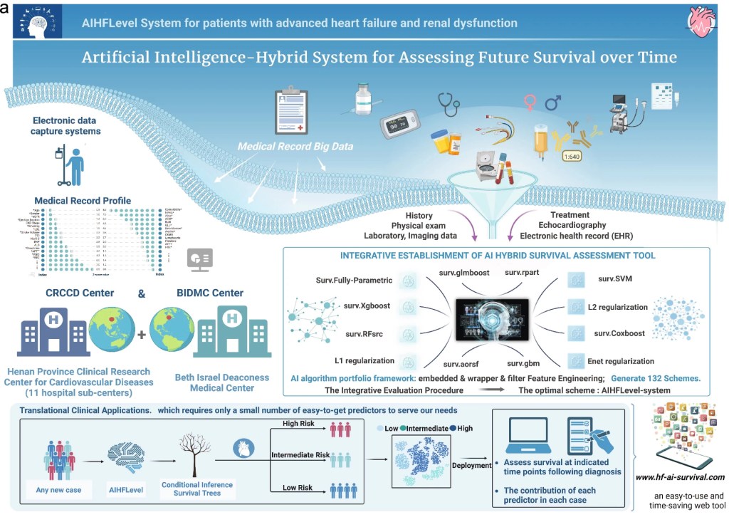 Ge Zhang, Zeyu Wang, Zhuang Tong, Zhen Qin, Chang Su, Demin Li, Shuai Xu, Kaixiang Li, Zhaokai Zhou, Yudi Xu, Shiqian Zhang, Ruhao Wu, Teng Li, Youyang Zheng, Jinying Zhang*, Ke Cheng* & Junnan Tang*. AI hybrid survival assessment for advanced heart failure patients with renal dysfunction. Nature Communications. 08 August 2024. https://doi.org/10.1038/s41467-024-50415-9