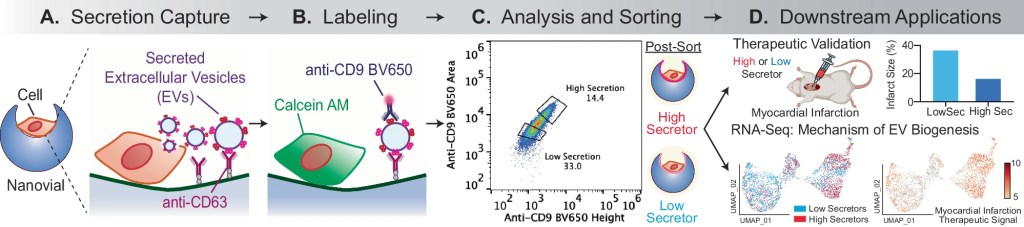 Doyeon Koo, Xiao Cheng, Shreya Udani, Sevana Baghdasarian, Dashuai Zhu, Junlang Li, Brian Hall, Natalie Tsubamoto, Shiqi Hu, Jina Ko, Ke Cheng* & Dino Di Carlo*. Optimizing cell therapy by sorting cells with high extracellular vesicle secretion. Nature Communications. 07 June 2024. https://doi.org/10.1038/s41467-024-49123-1